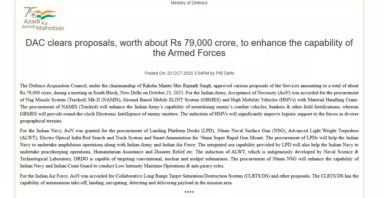 On October 23, 2025, the Defence Acquisition Council, chaired by Raksha Mantri Shri @rajnathsingh, approved Service proposals worth about ₹79,000 crore. The approvals include: