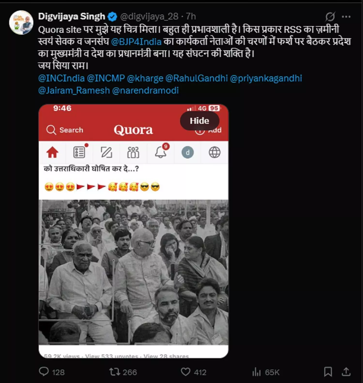 दिग्विजय सिंह ने की "संघ" की तारीफ: मोदी की फोटो पोस्ट कर लिखा- ‘फर्श पर बैठने वाला CM-PM बना; यही संगठन की ताकत’