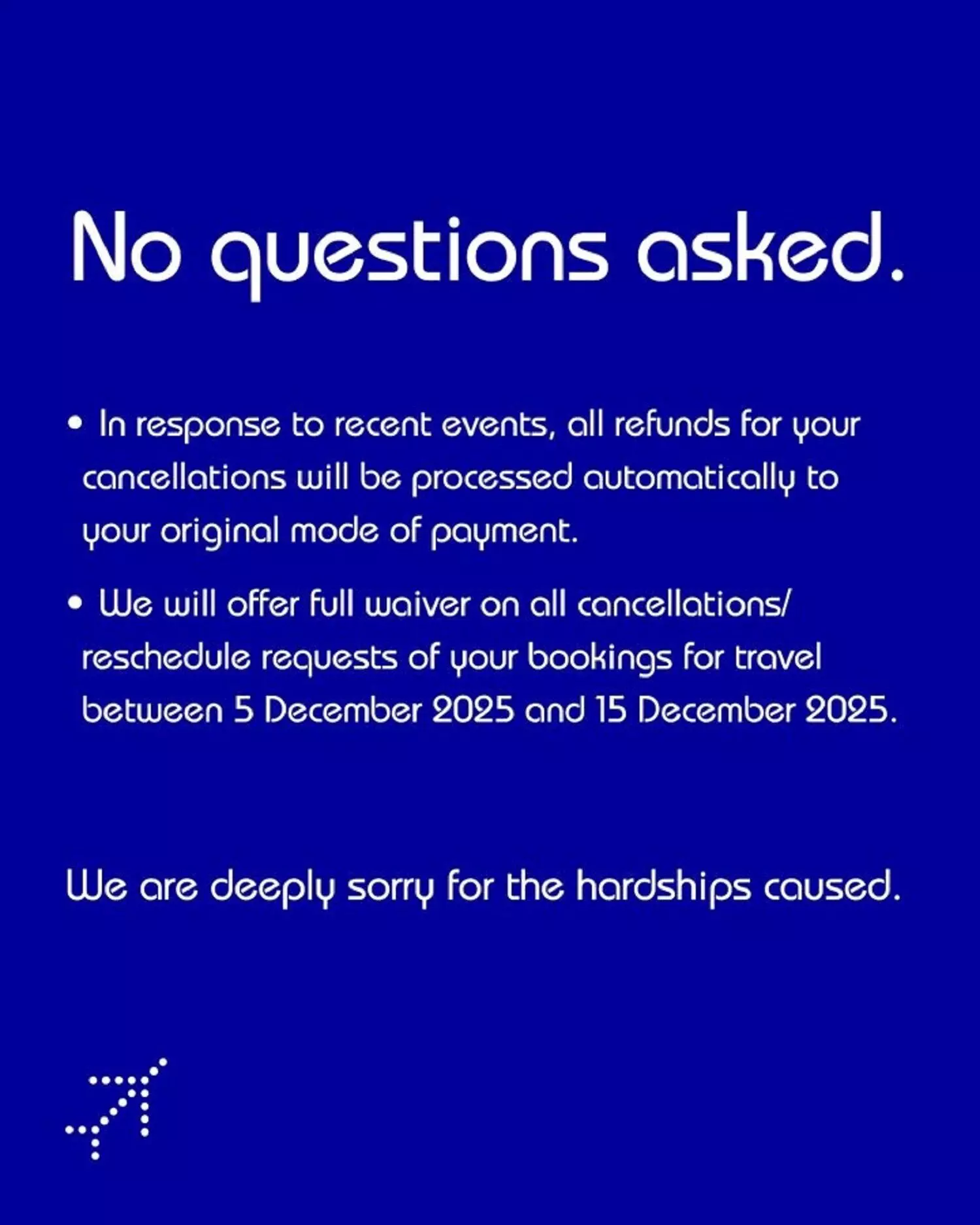 5 दिसंबर 2025 से 15 दिसंबर 2025 के बीच यात्रा करने वाली सभी बुकिंग्स पर हम कैंसलेशन या डेट चेंज के लिए पूरा छूट शुल्क माफ कर रहे हैं।