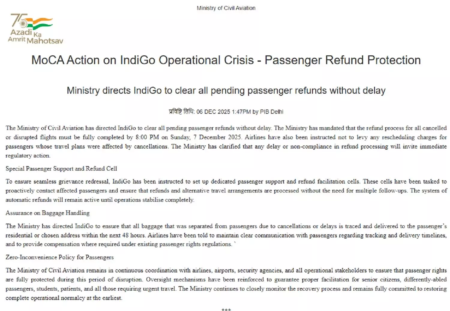 सिविल एविएशन मिनिस्ट्री ने इंडिगो को सभी पेंडिंग पैसेंजर रिफंड बिना देर किए क्लियर करने का निर्देश दिया है। मिनिस्ट्री ने आदेश दिया है कि सभी कैंसिल या रुकी हुई फ्लाइट्स के लिए रिफंड प्रोसेस रविवार, 7 दिसंबर 2025 को रात 8:00 बजे तक पूरी हो जानी चाहिए।