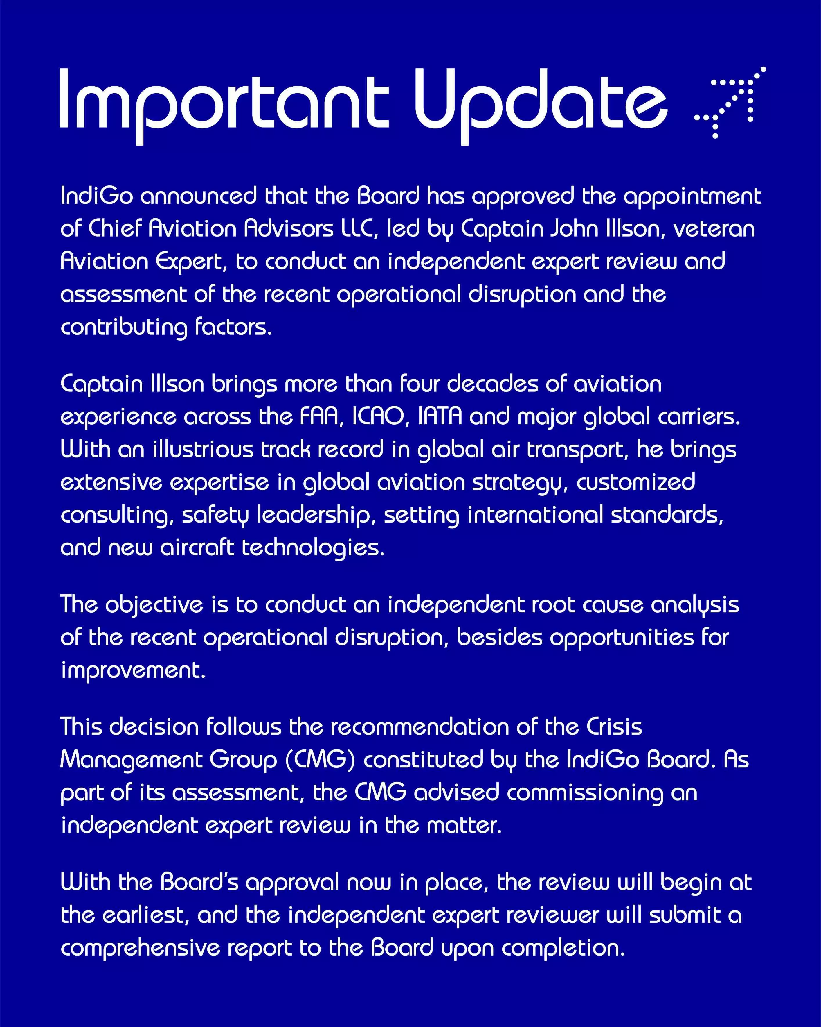 इस विशेषज्ञ टीम का नेतृत्व कैप्टन जॉन इल्सन करेंगे, जिनके पास FAA, ICAO, IATA और कई वैश्विक एयरलाइंस में 40 वर्षों से अधिक का अनुभव है। इंडिगो का कहना है कि इल्सन वैश्विक विमानन रणनीति, सुरक्षा नेतृत्व, मानक निर्धारण और नई टेक्नोलॉजी के विशेषज्ञ हैं।