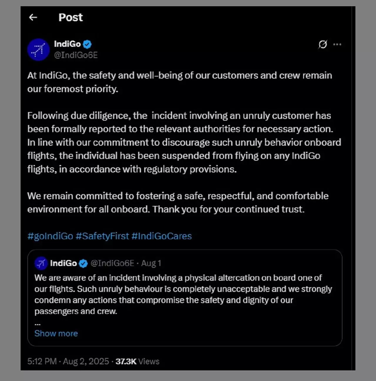 इंडिगो ने बयान में कहा है कि, "हम अपने यात्रियों और क्रू की सुरक्षा और सम्मान को सर्वोच्च प्राथमिकता देते हैं। जांच के बाद, आरोपी यात्री को नियमानुसार इंडिगो की सभी उड़ानों से निलंबित कर दिया गया है।"