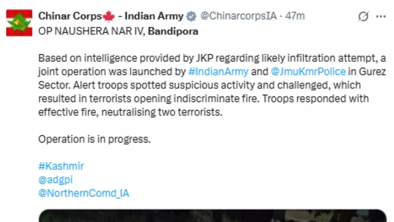 भारतीय सेना के चिनार कोर ने अपने आधिकारिक X हैंडल पर एनकाउंटर की जानकारी देते हुए लिखा-जम्मू-कश्मीर पुलिस से संभावित घुसपैठ के कोशिश की खुफिया जानकारी मिलने के बाद भारतीय सेना और जम्मू कश्मीर पुलिस ने गुरेज सेक्टर में संयुक्त अभियान शुरू किया। सतर्क जवानों ने संदिग्ध गतिविधि देखी और उन्हें चुनौती दी। परिणामस्वरूप आतंकवादियों ने अंधाधुंध गोलीबारी शुरू कर दी। जवानों ने प्रभावी जवाबी कार्रवाई करते हुए दो आतंकवादियों को मार गिराया। अभी अभियान जारी है।
