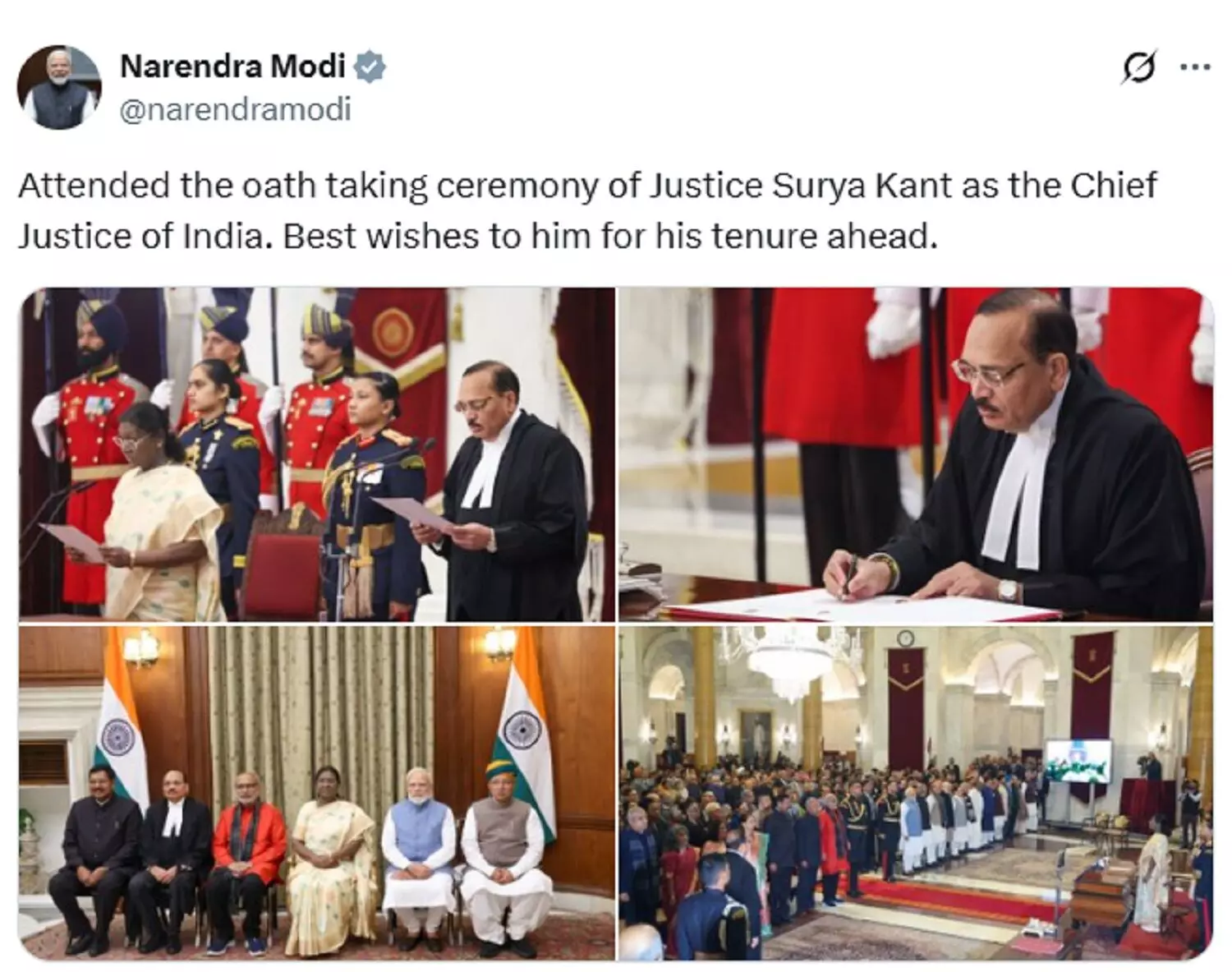 प्रधानमंत्री नरेंद्र मोदी ने कार्यक्रम के बाद सोशल मीडिया प्लेटफॉर्म 'एक्स' पर लिखा, "जस्टिस सूर्यकांत के भारत के चीफ जस्टिस के तौर पर शपथ ग्रहण समारोह में शामिल हुआ। उनके आगे के कार्यकाल के लिए उन्हें शुभकामनाएं।"
