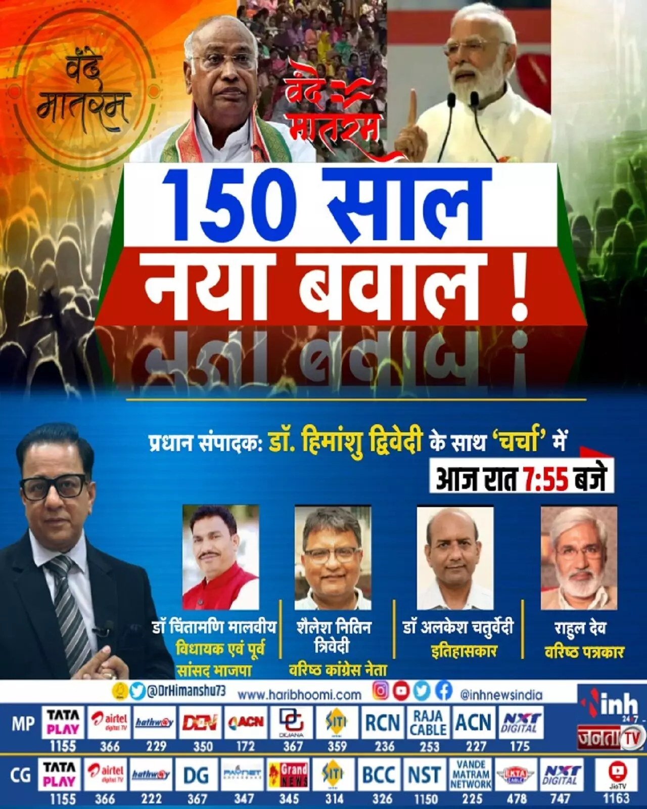 वंदे मातरम् पर नया बवाल: राष्ट्रीय गीत पर सियासी संग्राम- बीजेपी-कांग्रेस आमने-सामने | देखिए आज रात 7:55 बजे 'चर्चा' में बड़ी बहस