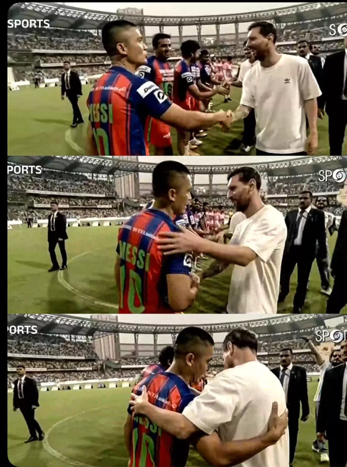 लियोनेल मेस्सी ने वानखेड़े स्टेडियम में भारतीय फुटबॉल कप्तान सुनील छेत्री और महान बल्लेबाज सचिन तेंदुलकर से भी मुलाकात की। सचिन ने मेस्सी को अपनी इंडिया जर्सी गिफ्ट की।