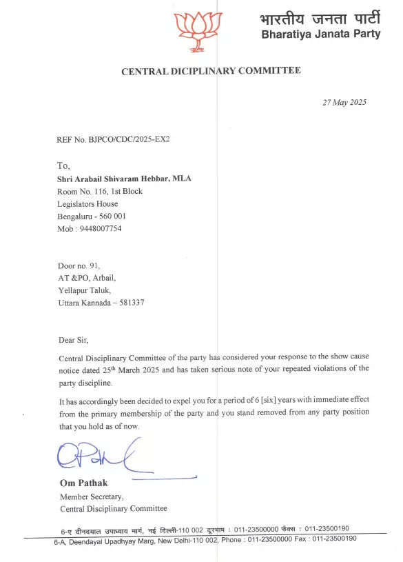 भारतीय जनता पार्टी की केंद्रीय अनुशासन समिति ने मंगलवार (27 मई) को पत्र जारी किया है। समिति के सदस्य सचिव ओम पाठक की ओर से जारी लेटर में कहा है कि 'पार्टी की केंद्रीय अनुशासन समिति ने 25 मार्च 2025 के कारण बताओ नोटिस पर आपके जवाब पर विचार किया। समिति ने आपके बार-बार उल्लंघन को गंभीरता से लिया है। इसलिए आपको पार्टी की प्राथमिक सदस्यता से तत्काल प्रभाव से 6 साल की अवधि के लिए निष्कासित करने का निर्णय लिया है। आप वर्तमान में पार्टी में किसी भी पद पर नहीं रहेंगे।