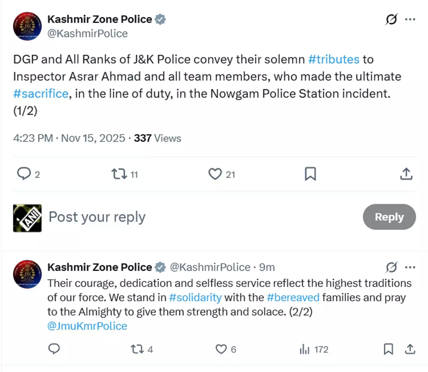 कश्मीर जोन पुलिस ने ट्वीट करते हुए कहा: "जम्मू-कश्मीर के डीजीपी सहित पुलिस के सभी रैंकों के अधिकारी इंस्पेक्टर असरार अहमद और उनकी पूरी टीम को हार्दिक श्रद्धांजलि अर्पित करते हैं। नौगाम थाने की घटना में कर्तव्य पालन के दौरान उन्होंने अपना सर्वोच्च बलिदान दिया। उनका अदम्य साहस, पूर्ण समर्पण और निस्वार्थ सेवा हमारी पुलिस फौज की सबसे ऊंची परंपराओं का प्रतीक है। हम शोकाकुल परिवारों के साथ कंधे से कंधा मिलाकर खड़े हैं और भगवान से प्रार्थना करते हैं कि उन्हें अपार शक्ति और सांत्वना प्रदान करें।"
