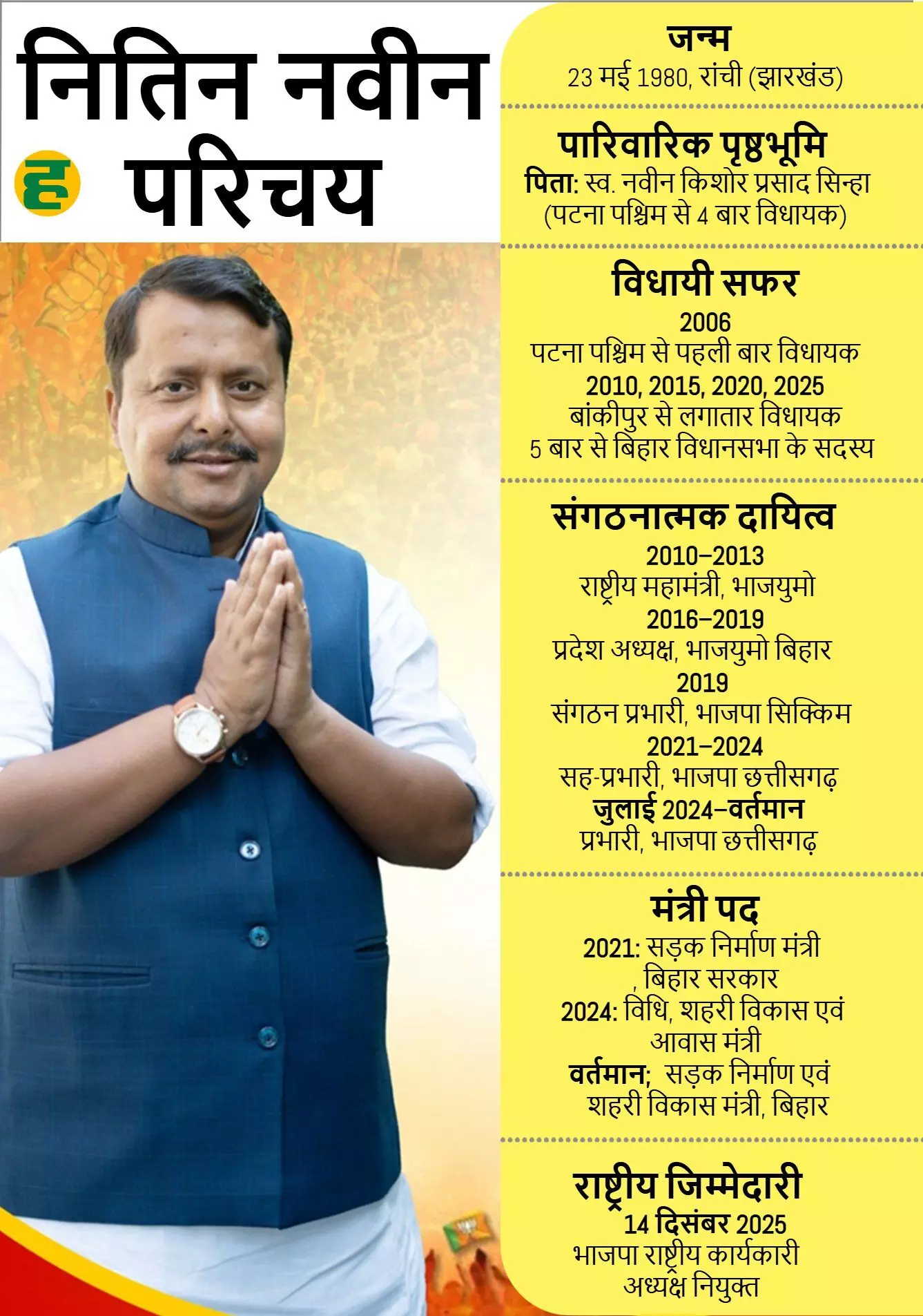 नितिन नबीन वर्तमान में बिहार की नीतीश सरकार में सड़क निर्माण मंत्री हैं। इसके साथ ही वे पटना के बांकीपुर विधानसभा क्षेत्र से विधायक हैं। मंत्री रहते हुए उन्हें राष्ट्रीय संगठन की जिम्मेदारी सौंपा जाना पार्टी नेतृत्व के उन पर भरोसे को दर्शाता है। संगठन के भीतर उनकी पहचान एक अनुशासित और निर्णयक्षम नेता के रूप में रही है।