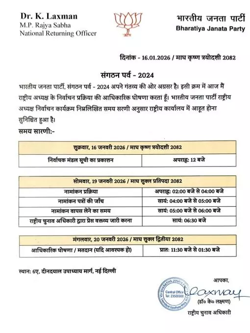 नई दिल्ली : भारतीय जनता पार्टी में नेतृत्व परिवर्तन की प्रक्रिया अब अपने अंतिम और निर्णायक पड़ाव पर पहुँच गई है। पार्टी के राष्ट्रीय चुनाव अधिकारी डॉ. के. लक्ष्मण ने भाजपा के नए राष्ट्रीय अध्यक्ष के निर्वाचन के लिए आधिकारिक समय-सारणी जारी कर दी है।