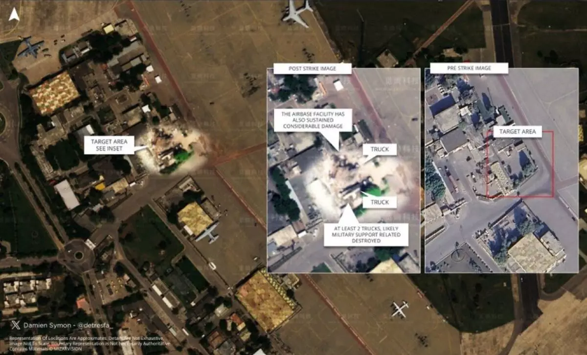 रावलपिंडी में स्थित नूर खान एयरबेस पाकिस्तान की सबसे महत्वपूर्ण रणनीतिक हवाई पट्टी है। सैटेलाइट इमेज में इसके ध्वस्त बुनियादी ढांचे और ग्राउंडेड सपोर्ट व्हीकल को स्पष्ट रूप से दिखाया गया है।