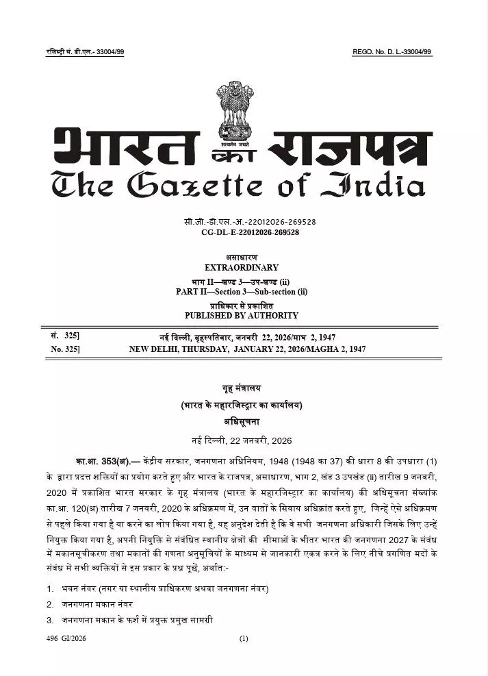 नई दिल्ली : भारत सरकार ने देश की आगामी जनगणना (Census 2027) के लिए औपचारिक प्रक्रिया शुरू कर दी है। केंद्र सरकार द्वारा जारी आधिकारिक नोटिफिकेशन के अनुसार, इस महाअभियान के पहले चरण में मकानों की सूची तैयार करने और उनके सूचीकरण का काम किया जाएगा।