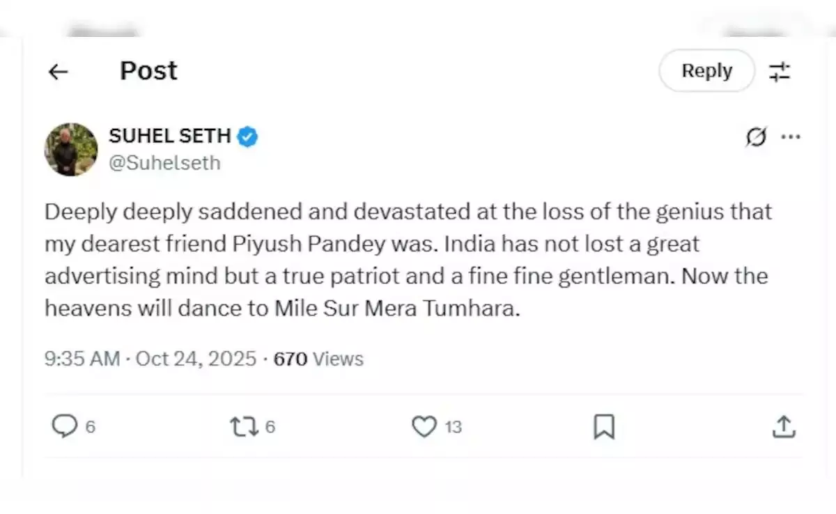 सुहैल सेठ ने X पर लिखा,“भारत ने अपने सबसे महान क्रिएटिव दिमागों में से एक को खो दिया है। पीयूष पांडे सिर्फ एक एड गुरु नहीं, बल्कि भारत की आवाज़ थे।”