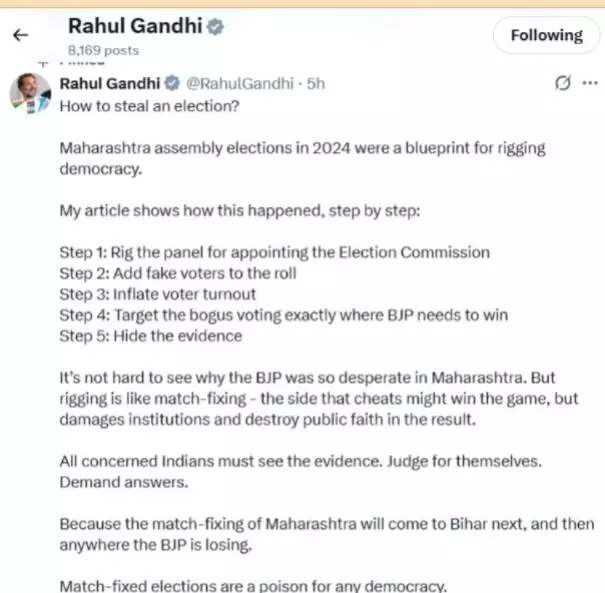 राहुल ने 'X' पर लिखा-2024 में महाराष्ट्र विधानसभा चुनाव लोकतंत्र में धांधली करने का खाका था। मेरा लेख दिखाता है कि यह कैसे हुआ। राहुल ने लिखा-चरण 1: चुनाव आयोग की नियुक्ति के लिए पैनल में धांधली। चरण 2: फर्जी मतदाताओं को मतदाता सूची में शामिल करें। चरण 3: मतदान प्रतिशत बढ़ाएं। राहुल ने चरण-4 में बताया9फर्जी मतदान को ठीक उसी जगह लक्षित करें जहां भाजपा को जीतना है। आखिरी और पांचवें चरण में राहुल ने बताया कि सबूत छिपाएं।