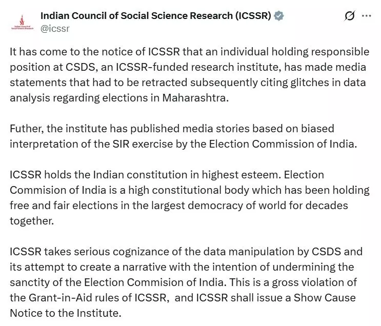 ICSSR ने कहा कि चुनाव आयोग भारत की सबसे बड़ी लोकतंत्र में निष्पक्ष चुनाव कराने वाली संवैधानिक संस्था है, जिसका सम्मान करना जरूरी है। उसने CSDS पर डेटा हेरफेर कर चुनाव आयोग की गरिमा को ठेस पहुंचाने की कोशिश का आरोप लगाया, जो ICSSR के अनुदान नियमों का उल्लंघन है। इस मामले में ICSSR ने CSDS को शो कॉज नोटिस जारी किया है और आगे की कार्रवाई की तैयारी में है।