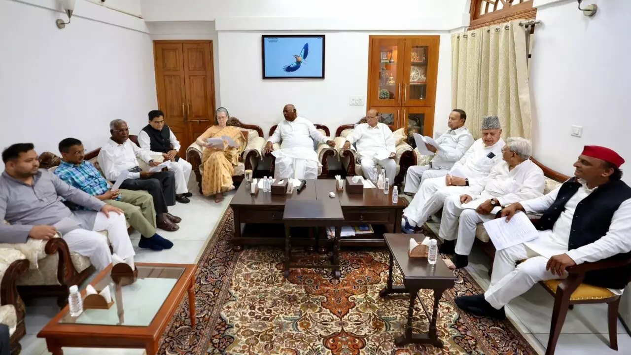 इंडिया गठबंधन ने आज दोपहर 12:30 बजे कांग्रेस अध्यक्ष मल्लिकार्जुन खड़गे के आवास पर महत्वपूर्ण बैठक बुलाई है। इसमें सभी विपक्षी दलों के नेता शामिल होंगे। राहुल गांधी बिहार से बर्चुअल जुड़ेंगे। माना जा रहा है कि इसी मीटिंग में साझा उम्मीदवार पर सहमति बनाकर इसकी आधिकारिक घोषणा कर दी जाएगी।
