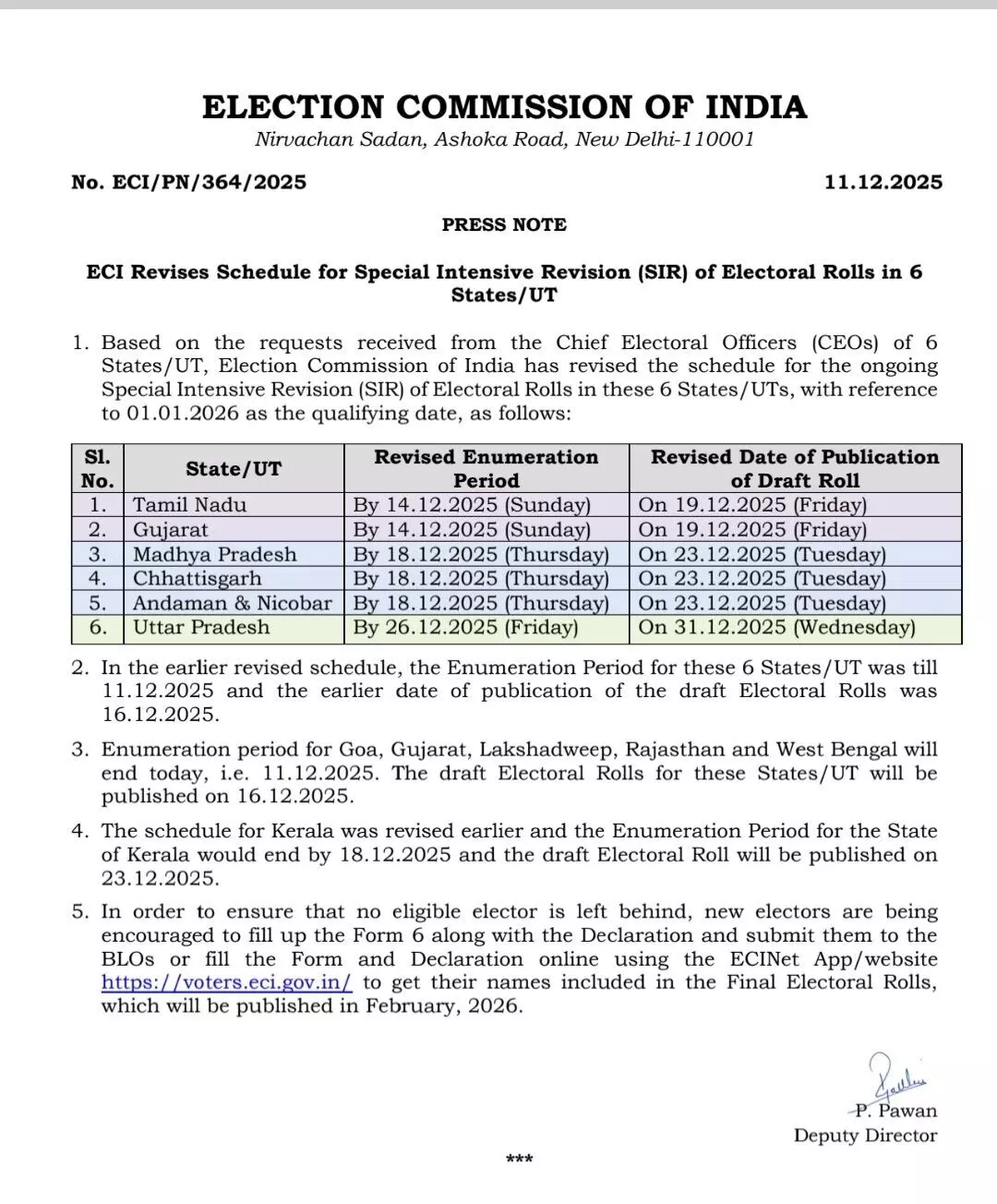 - तमिलनाडु और गुजरात: पहले 14 दिसंबर 2025 (रविवार) थी डेडलाइन, अब बढ़ाकर 19 दिसंबर 2025 (शुक्रवार) कर दी गई।