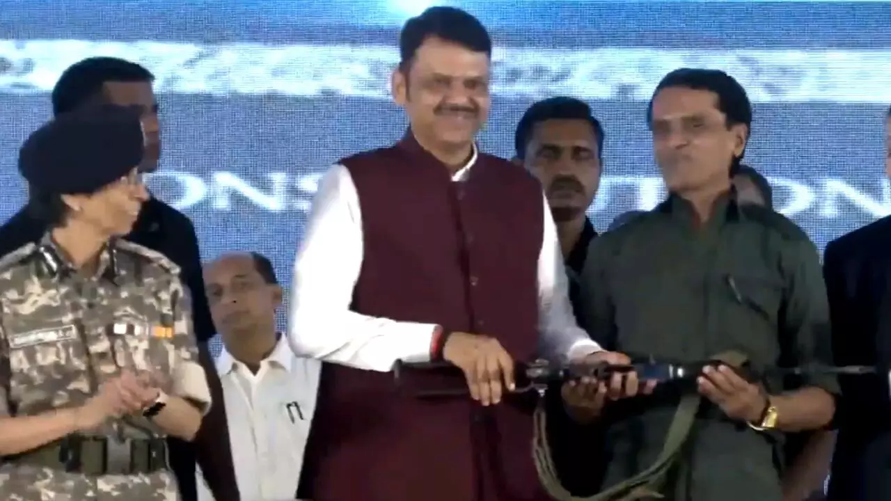 सीएम देवेंद्र फडणवीस की मौजूदगी में नक्सल कमांडर भूपति सरेंडर करते हुए।