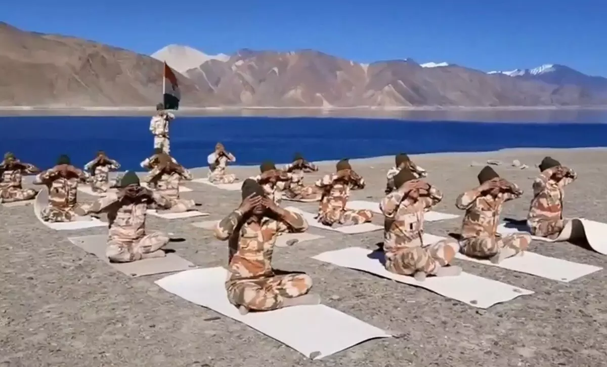 लेह में 14,200 फीट ऊंचाई पर पैंगोंग त्सो झील के किनारे ITBP के जवानों ने योग किया।