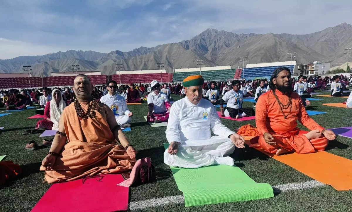 केंद्रीय मंत्री अर्जुनराम मेघवाल ने ऐतिहासिक लेह पैलेस में योग किया।