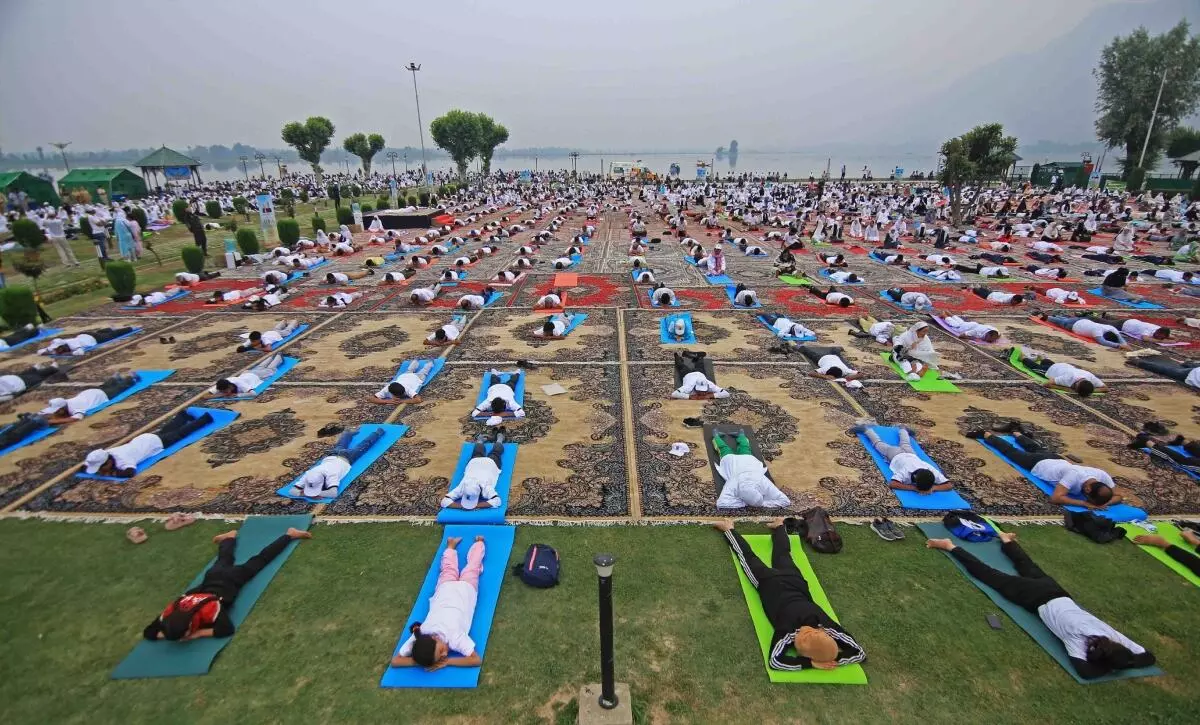 डल झील (श्रीनगर) के किनारे सैकड़ों लोगों ने सामूहिक योग में हिस्सा लिया।