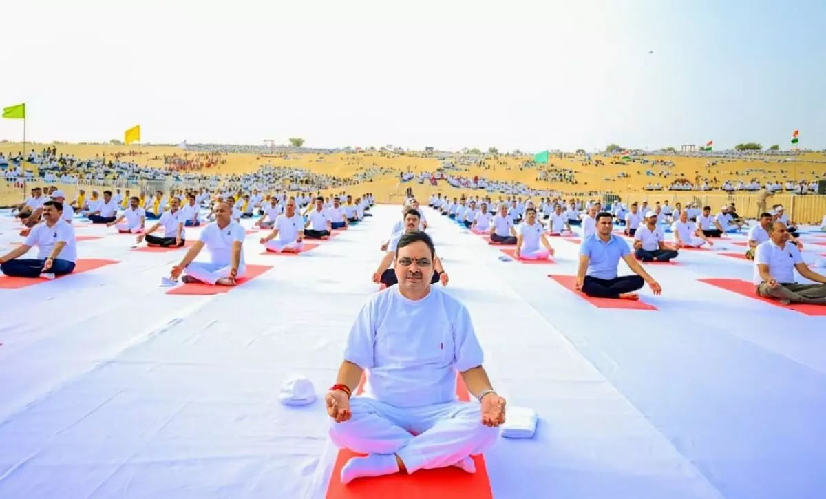 राजस्थान के थार रेगिस्तान में रेत के बीच योग करते लोगों की तस्वीरें अद्वितीय रहीं। सीएम भजन लाल शर्मा ने भी लोगों के साथ योग किया।