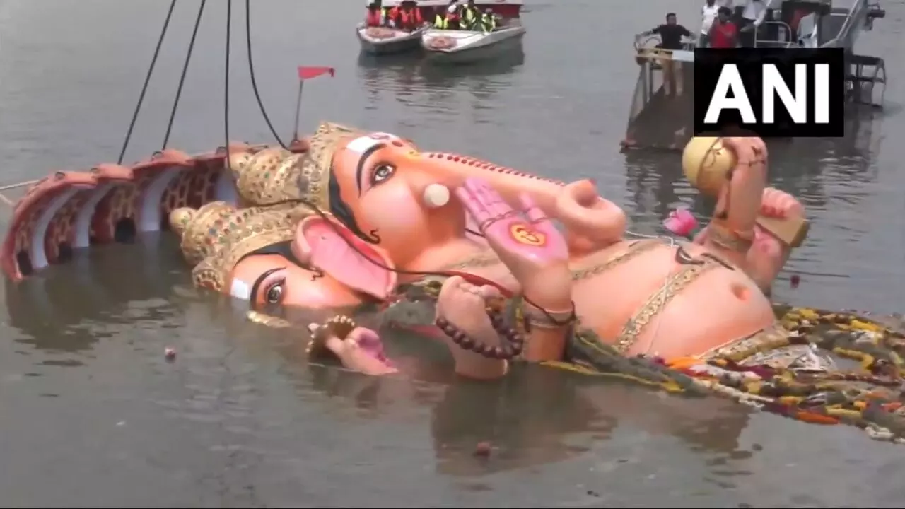 Hyderabad Ganpati visarjan live Update: खैरताबाद की 69 फीट ऊंची भगवान गणेश की मूर्ति को हुसैन सागर झील में विसर्जित किया गया।