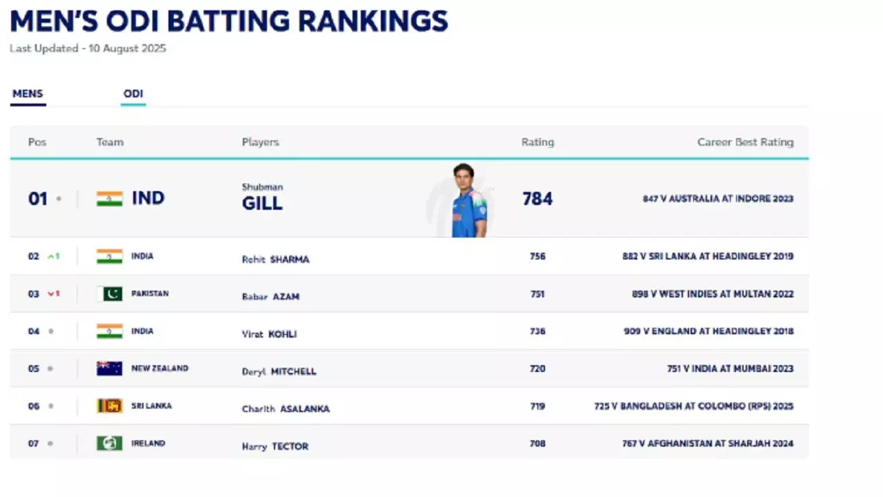 पुरुषों की बल्लेबाजी रैंकिंग में, शुभमन गिल 784 अंकों के साथ शीर्ष पर बने हुए हैं जबकि श्रेयस अय्यर आठवें स्थान के साथ शीर्ष 10 में शामिल अन्य भारतीय हैं।