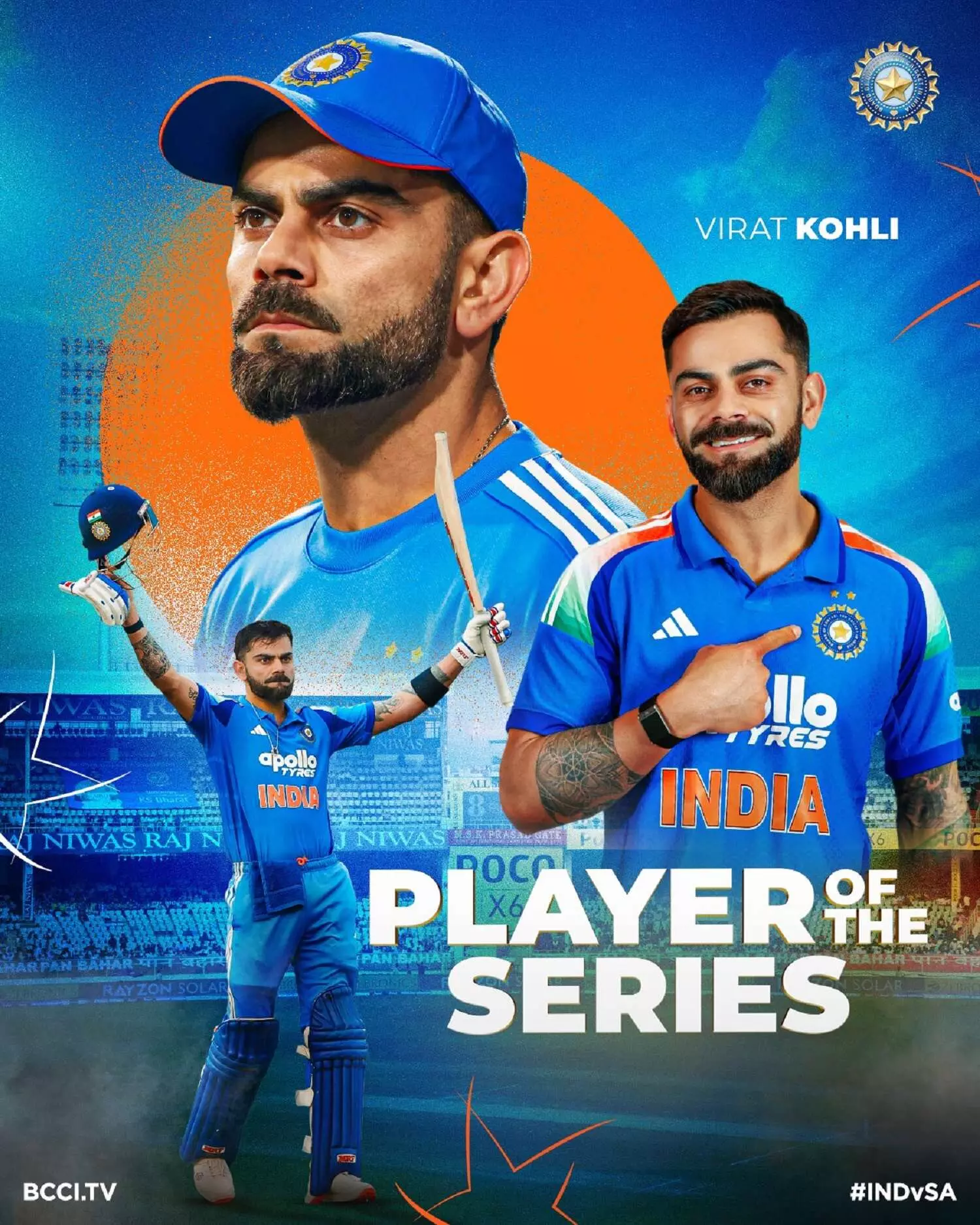 सीरीज में शानदार प्रदर्शन करने वाले विराट कोहली को प्लेयर ऑफ द सीरीज चुना गया। ट्रॉफी के दौरान कोहली ने कहा— “इस सीरीज में जिस तरह से मैंने बल्लेबाज़ी की, उससे मैं काफी खुश हूं। ईमानदारी से कहूं तो पिछले दो-तीन सालों में इस तरह की निरंतरता नहीं देखी थी।”