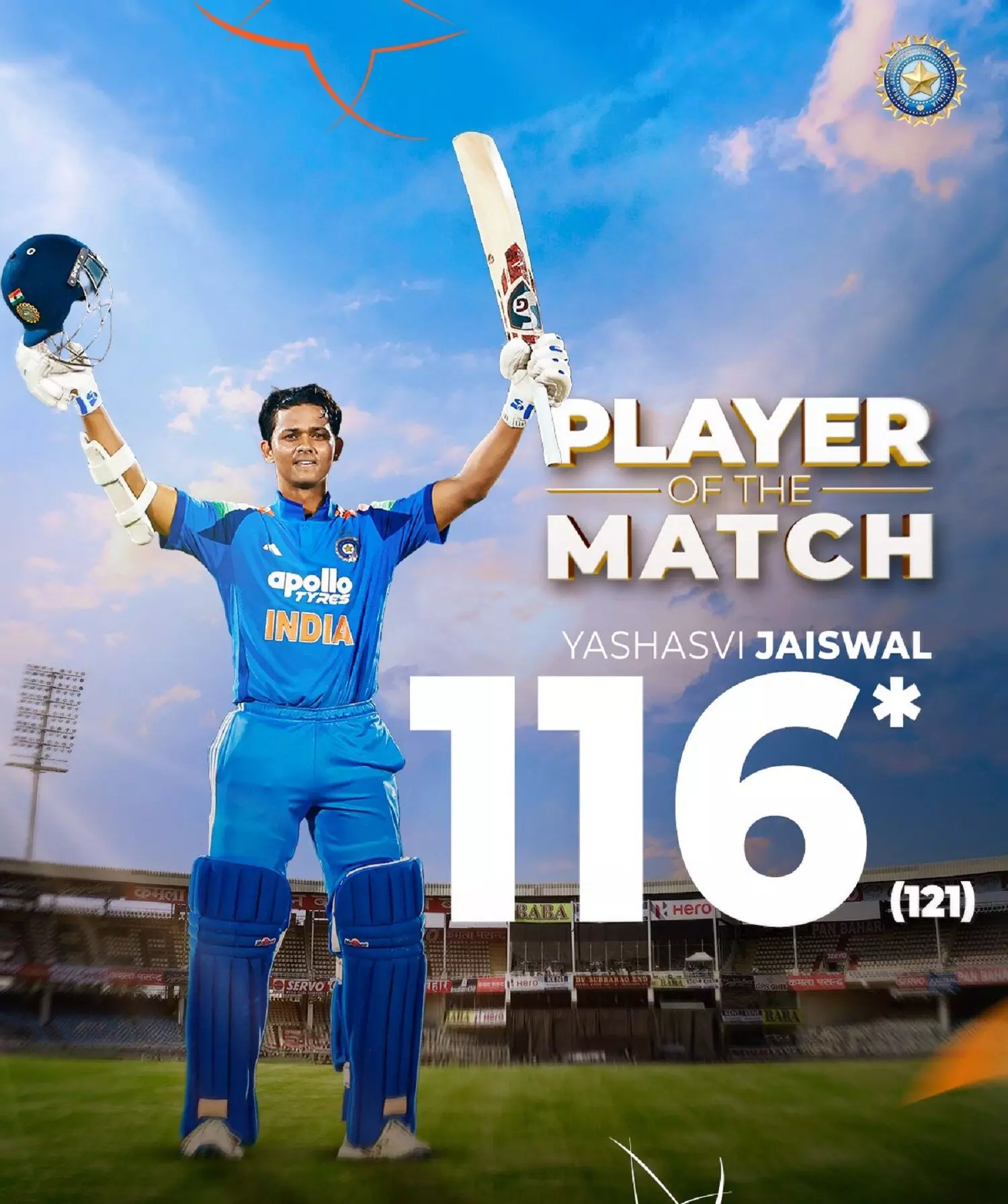 यशस्वी जायसवाल ने 111 गेंद पर अपने वनडे करियर का पहला शतक लगाया। वो 116 रन बनाकर नाबाद लौटे। उन्होंने अपनी पारी में 2 छक्के और 12 चौके लगाए। उन्हें प्लेयर ऑफ द मैच का अवॉर्ड दिया गया।