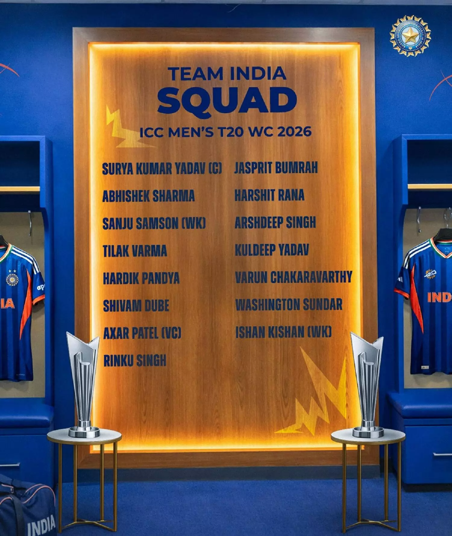 टी20 विश्व कप 2026 के लिए भारतीय टीम: सूर्यकुमार यादव (कप्तान), अक्षर पटेल (उपकप्तान), अभिषेक शर्मा, तिलक वर्मा, संजू सैमसन, हार्दिक पंड्या, रिेंकू सिंह, शिवम दुबे, कुलदीप यादव, वॉशिंगटन सुंदर, हर्षित राणा, वरुण चक्रवर्ती, जसप्रीत बुमराह, अर्शदीप सिंह और ईशान किशन।