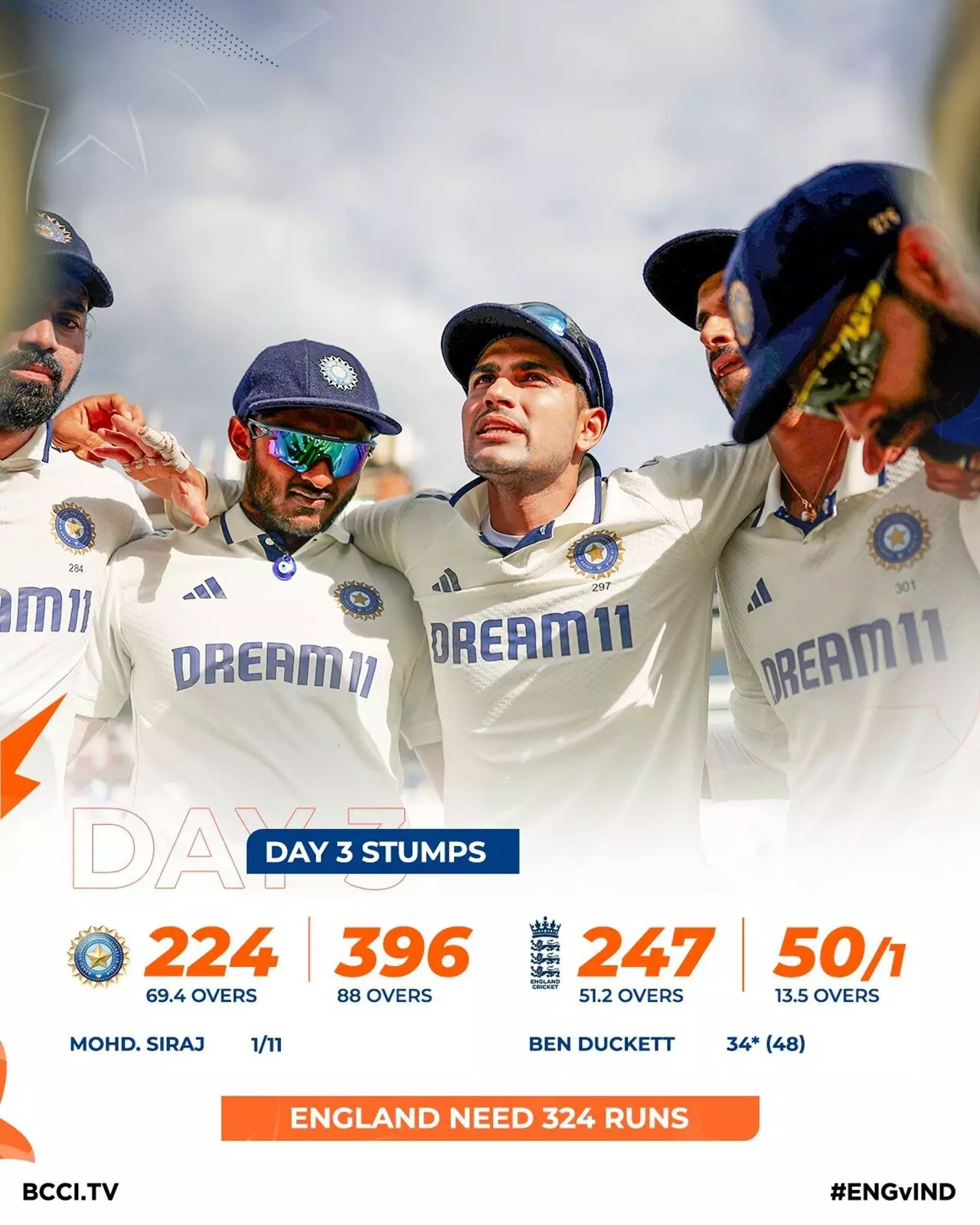 तीसरे दिन का खेल खत्म होने से पहले मोहम्मद सिराज ने इंग्लैंड को पहला झटका देने में सफल रहे। उन्होंने शानदार यॉर्कर से जैक क्राउली (14) को बोल्ड कर दिया। इंग्लैंड ने एक विकेट के नुक़सान पर 50 रन बनाए। बेन डकेट 34 रन बनाकर नाबाद रहे। इंग्लैंड को अभी जीत के लिए 324 रनों की जरूरत है, जबकि भारत को 9 विकेट चाहिए। चौथा दिन रोमांचक होने की उम्मीद है, क्योंकि भारत सीरीज को 2-2 से बराबर करने के लिए जोर लगाएगा।