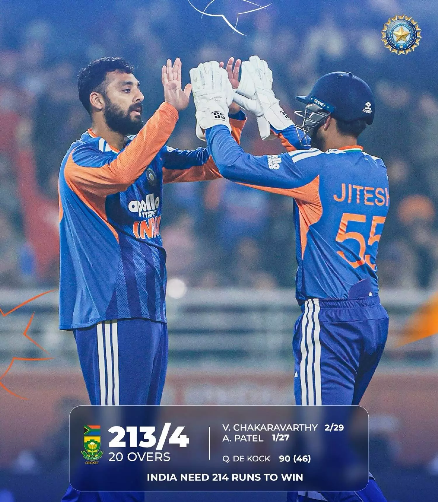 साउथ अफ्रीका ने भारत को दिया 214 रन का टारगेट दिया है। क्विंटन डी कॉक ने 90 रन की पारी खेली। गेंदबाजी में वरुण चक्रवर्ती को 2 विकेट मिले। अक्षर पटेल ने एक विकेट लिया। अर्शदीप सिंह ने 13 बॉल का एक ओवर डाला, जिसमें 7 वाइड शामिल हैं।