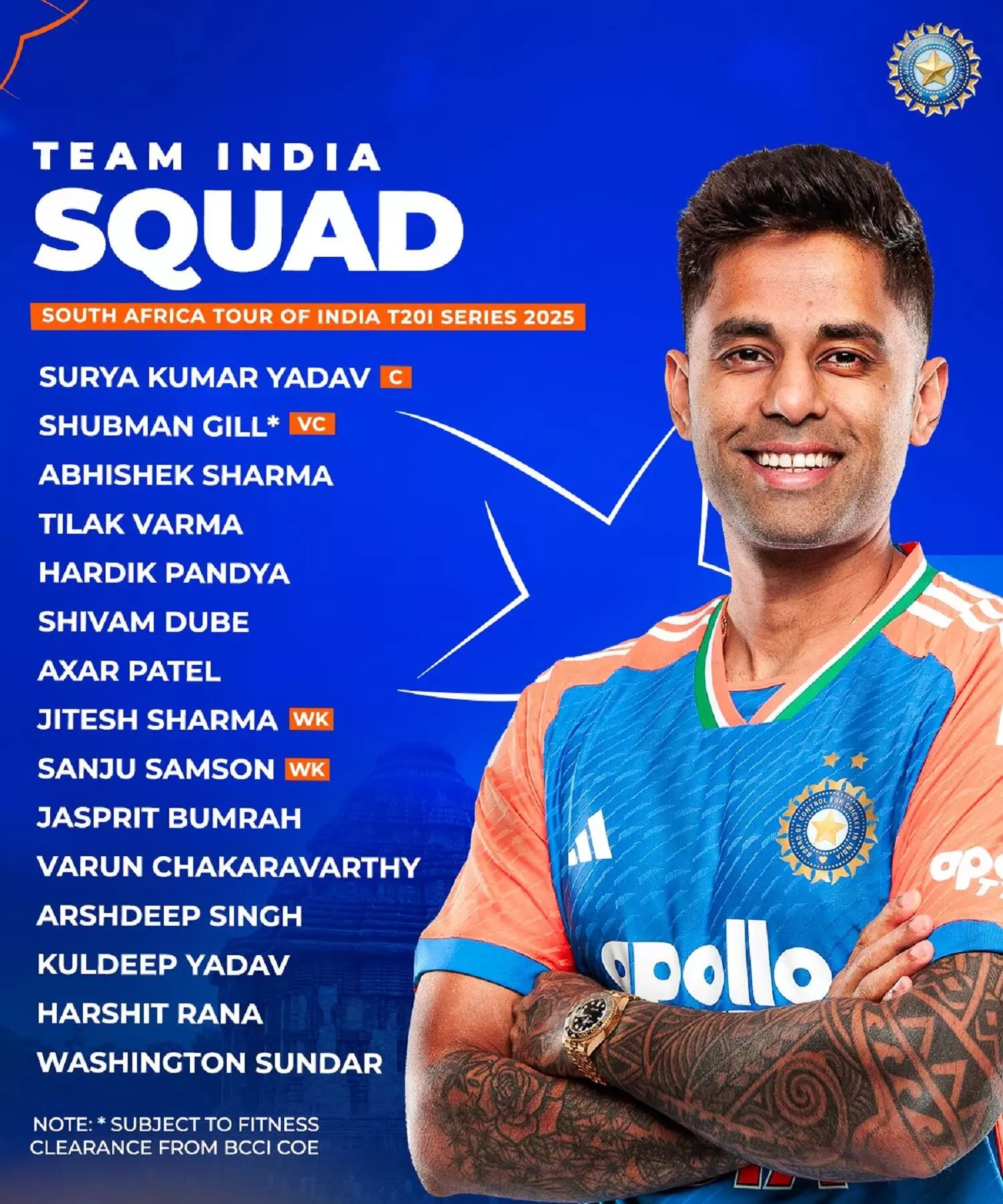 सूर्यकुमार यादव (कप्तान), शुभमन गिल (उपकप्तान)*, अभिषेक शर्मा, तिलक वर्मा, हार्दिक पांड्या, शिवम दुबे, अक्षर पटेल, जितेश शर्मा (विकेट कीपर), संजू सैमसन (विकेट कीपर), जसप्रीत बुमराह, वरुण चक्रवर्ती, अर्शदीप सिंह, कुलदीप यादव, हर्षित राणा, वाशिंगटन सुंदर।