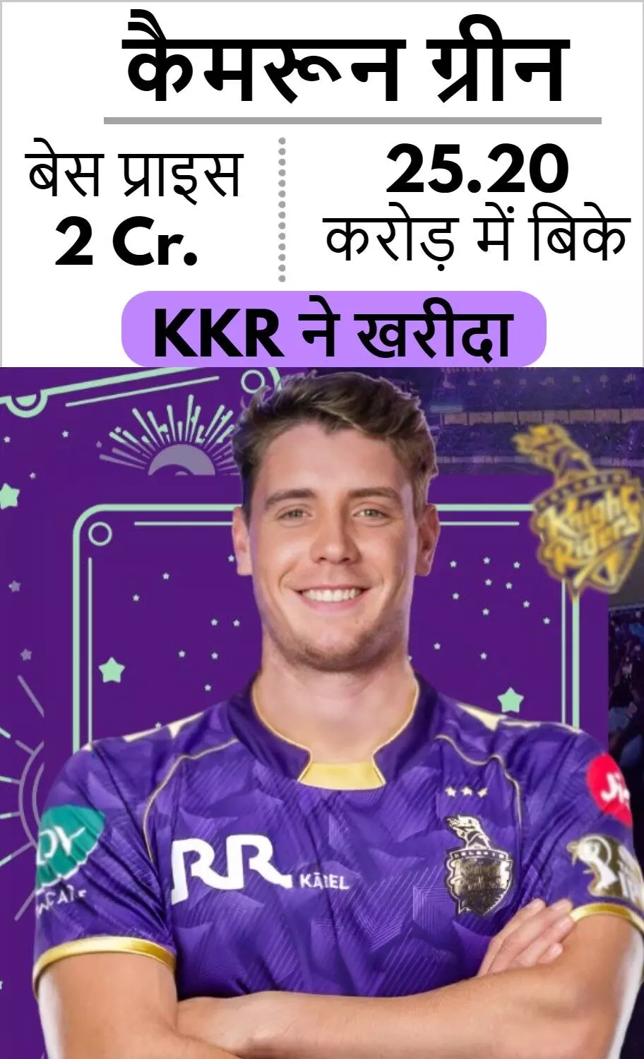 ऑस्ट्रेलिया के ऑलराउंडर कैमरन ग्रीन को कोलकाता नाइट राइडर्स (KKR) ने 25.20 करोड़ रुपए में खरीदकर इतिहास रच दिया। उन्होंने अपने हमवतन मिचेल स्टार्क का रिकॉर्ड तोड़ा, जिन्हें 2024 में KKR ने 24.75 करोड़ में खरीदा था। IPL के सबसे महंगे खिलाड़ियों की लिस्ट में ऋषभ पंत (27 करोड़, 2025 मेगा ऑक्शन) पहले और श्रेयस अय्यर (26.75 करोड़) दूसरे स्थान पर हैं।