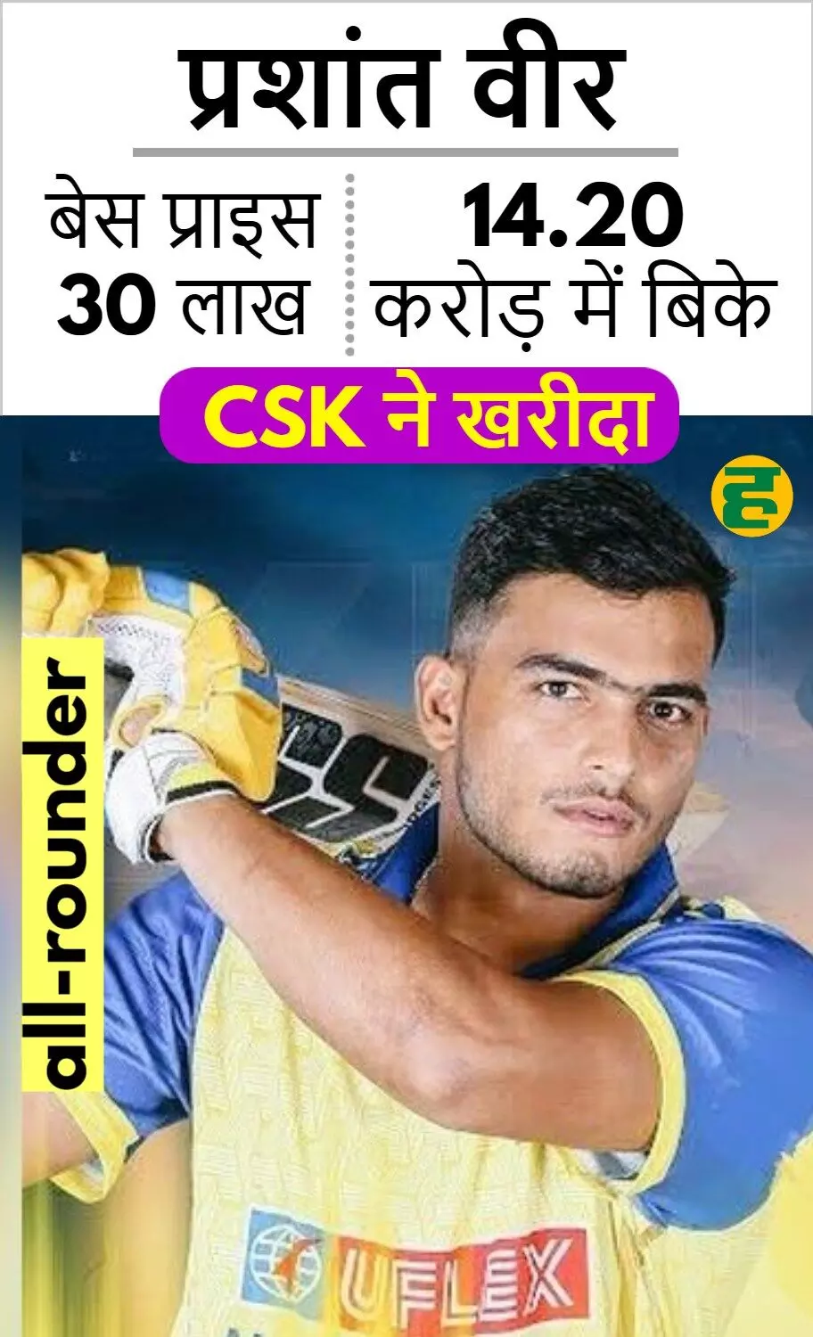 चेन्नई सुपर किंग्स (CSK) ने युवा प्रतिभाओं पर जमकर निवेश किया। 20 साल के उत्तर प्रदेश के प्रशांत वीर (लेफ्ट-आर्म स्पिन ऑलराउंडर) और 19 साल के राजस्थान के कार्तिक शर्मा (विकेटकीपर-बल्लेबाज) को 14.20-14.20 करोड़ रुपए में खरीदा। दोनों की बेस प्राइस मात्र 30 लाख थी, यानी करीब 47 गुना ज्यादा! CSK ने इन दोनों पर कुल 28.40 करोड़ खर्च किए।