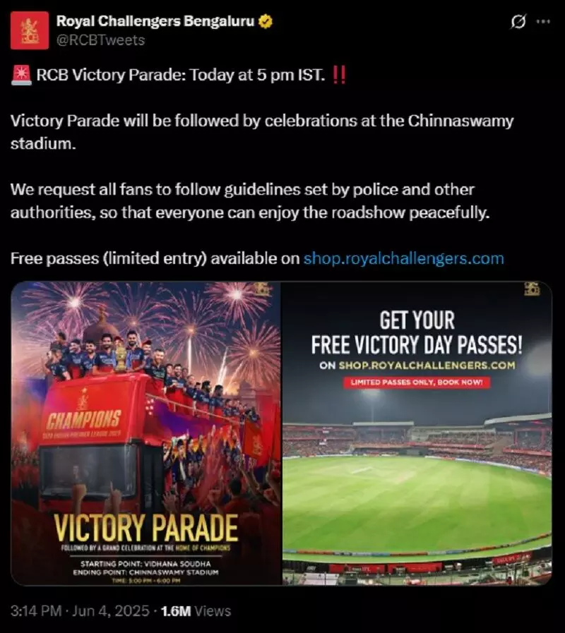 सबसे बड़ा सवाल यह है कि RCB ने ट्विटर (अब X) पर जिस परेड की जानकारी शेयर की थी, वह सरकारी मंजूरी नहीं मिलने के चलते पहले ही कैंसिल हो चुकी थी। लेकिन इसके बावजूद टीम ने X पर समय और स्थान की जानकारी देते हुए एक पोस्ट शेयर किया, जिसे लाखों फैंस ने देखा और उस आधार पर जुट गए।