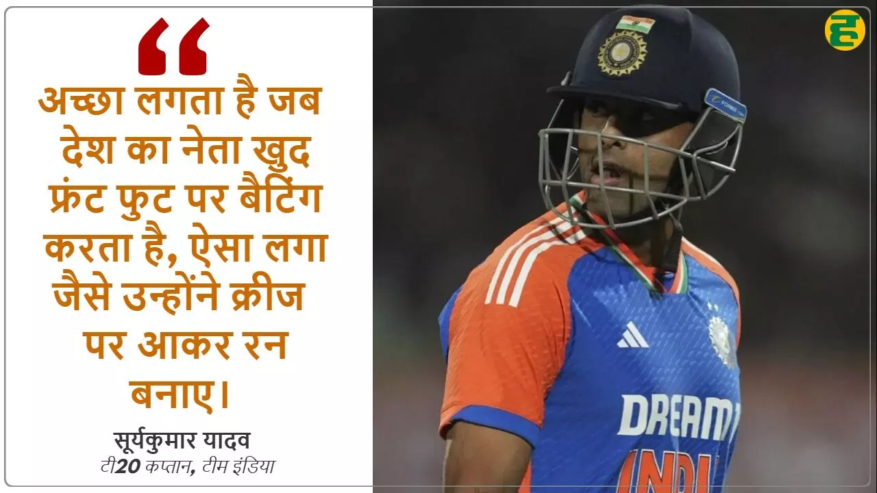सूर्यकुमार यादव ने पीएम मोदी के बयान पर कहा, 'अच्छा लगता है जब देश का नेता खुद फ्रंट फुट पर बैटिंग करता है, ऐसा लगा जैसे उन्होंने क्रीज पर आकर रन बनाए। जब ‘सर’ सामने खड़े रहते हैं तो खिलाड़ी अपने आप खुलकर खेलते हैं।' उन्होंने आगे कहा कि पूरी टीम को गर्व है कि पूरा देश इस जीत का जश्न मना रहा और जब वे भारत लौटेंगे तो उन्हें और मोटिवेशन मिलेगा।