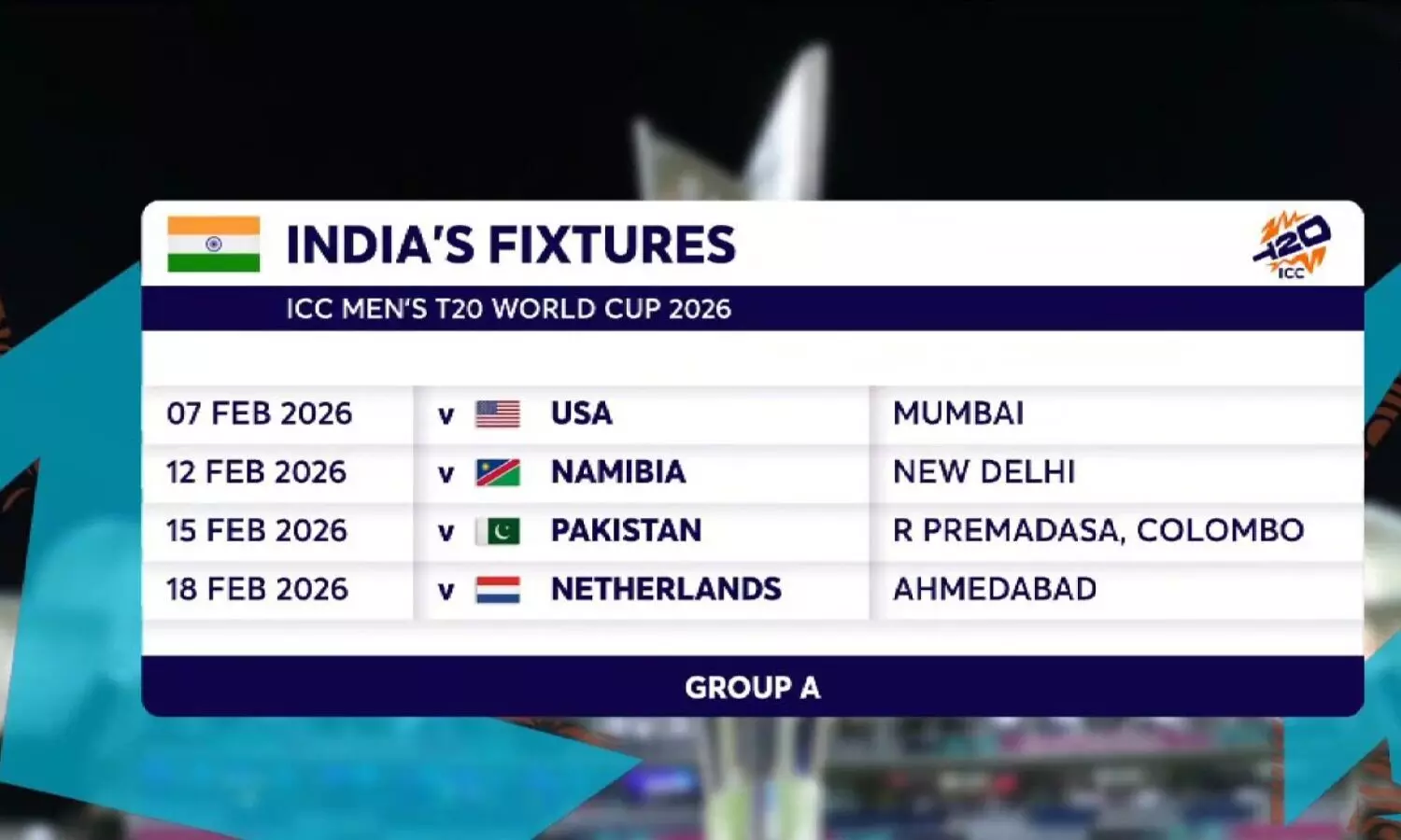 Here are #TeamIndia's group stage fixtures for the ICC Men's T20 World Cup 2026! 🗓️#T20WorldCup pic.twitter.com/MdL6Qa9mlg