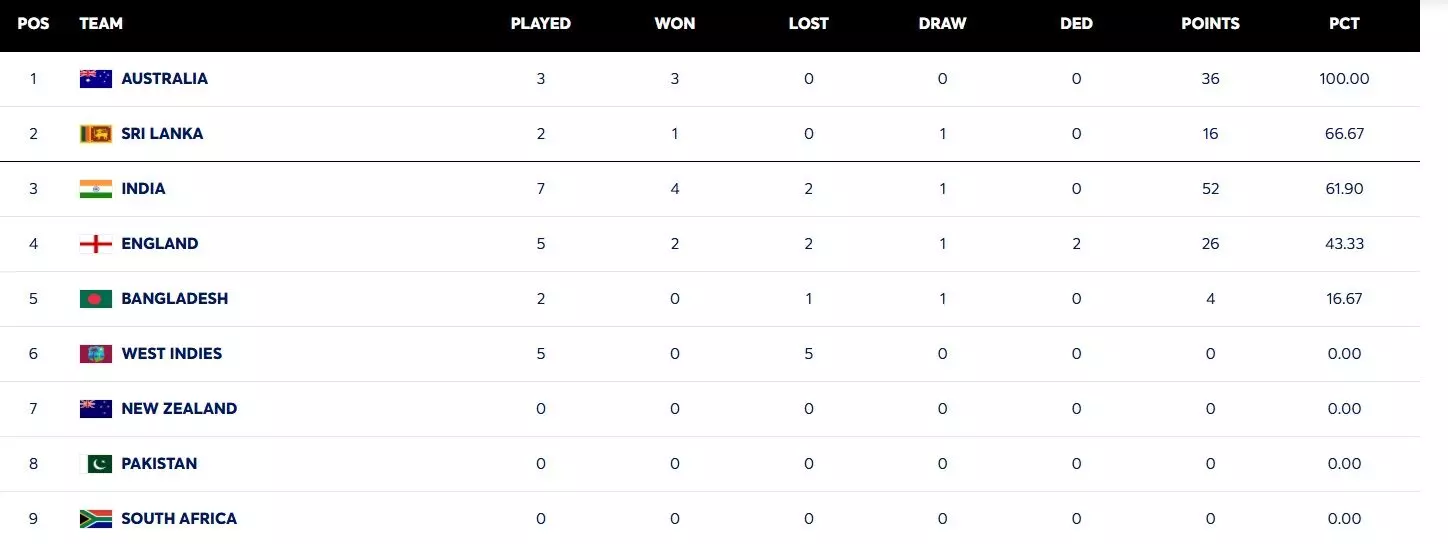 ऑस्ट्रेलिया अब भी टॉप पर कायम है। कंगारू टीम ने अब तक खेले गए तीनों टेस्ट जीते हैं और उनका पर्सेंटेज पॉइंट 100 है। वहीं श्रीलंका एक जीत और एक हार के साथ 66.67 पीसीटी के साथ दूसरे स्थान पर है। भारत तीसरे नंबर पर है जबकि इंग्लैंड, बांग्लादेश और वेस्टइंडीज क्रमशः चौथे, पांचवें और छठे स्थान पर हैं।