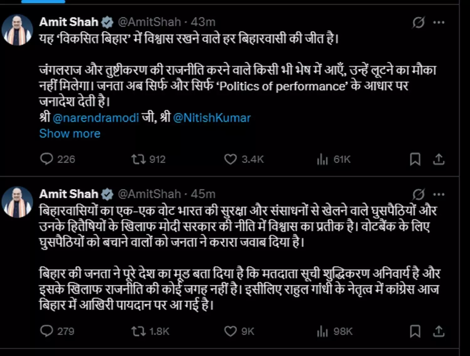 गृह मंत्री ने लिखा कि बिहार के हर एक वोट में देश की सुरक्षा और घुसपैठियों के खिलाफ केंद्र सरकार की नीति पर जनता का अटूट विश्वास दिखाई देता है। उन्होंने कहा कि जो दल वोट बैंक की राजनीति के लिए घुसपैठियों को बचाते थे, उन्हें इस चुनाव में जनता ने पूरी तरह नकार दिया। साथ ही मतदाता सूची के शुद्धिकरण पर बिहार की जनता ने स्पष्ट राय दी है कि इस मुद्दे पर राजनीति अब स्वीकार्य नहीं है।