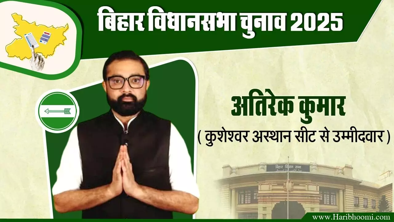 अतिरेक कुमार को जनता दल यूनाइटेड ने कुशेश्वरस्थान विधानसभा सीट से टिकट दिया है। इस सीट राजनीतिक रूप से उनकी मजबूत पकड़ है, क्योंकि यहां से इनके पिता डॉ. अशोक कुमार भी विधायक रह चुके हैं। जेडीयू ने इस बार इस सीट पर एक नए और युवा चेहरे पर दांव खेला है। अब यह देखना दिलचस्प होगा कि जनता दल यूनाइटेड का प्रयोग कैसा रहेगा।