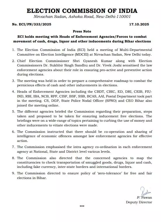 भारतीय चुनाव आयोग (ईसीआई) ने बिहार चुनाव के दौरान नकदी, नशीली दवाओं, शराब और अन्य प्रलोभनों की आवाजाही से निपटने के लिए प्रवर्तन एजेंसियों/बलों के प्रमुखों के साथ बैठक की।