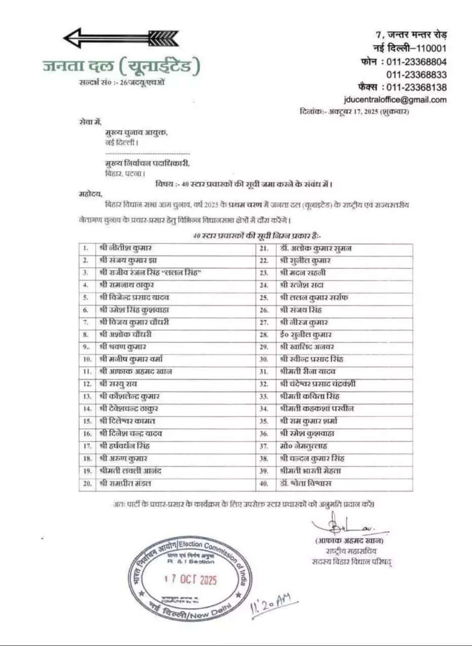 बिहार चुनाव 2025-Live Updates: जनता दल यूनाइटेड ने बिहार चुनाव के लिए स्टार प्रचारकों की सूची जारी कर दी है। सूची में सीएम नीतीश कुमार सहित कुल 40 प्रचारकों के नाम शामिल हैं।