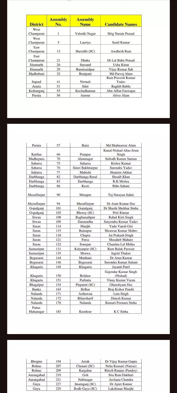 पहली लिस्ट में कई बड़े और चर्चित नाम शामिल हैं। वाल्मीकिनगर से दीर्घ नारायण प्रसाद, अमौर (पूर्णिया) से अफरोज आलम, प्राणपुर (कटिहार) से कुणाल निषाद, निर्मली (सुपौल) से रामप्रवेश कुमार यादव, सुरसंड से ऊषा किरण और लोरिया से सुनील कुमार को टिकट मिला है।