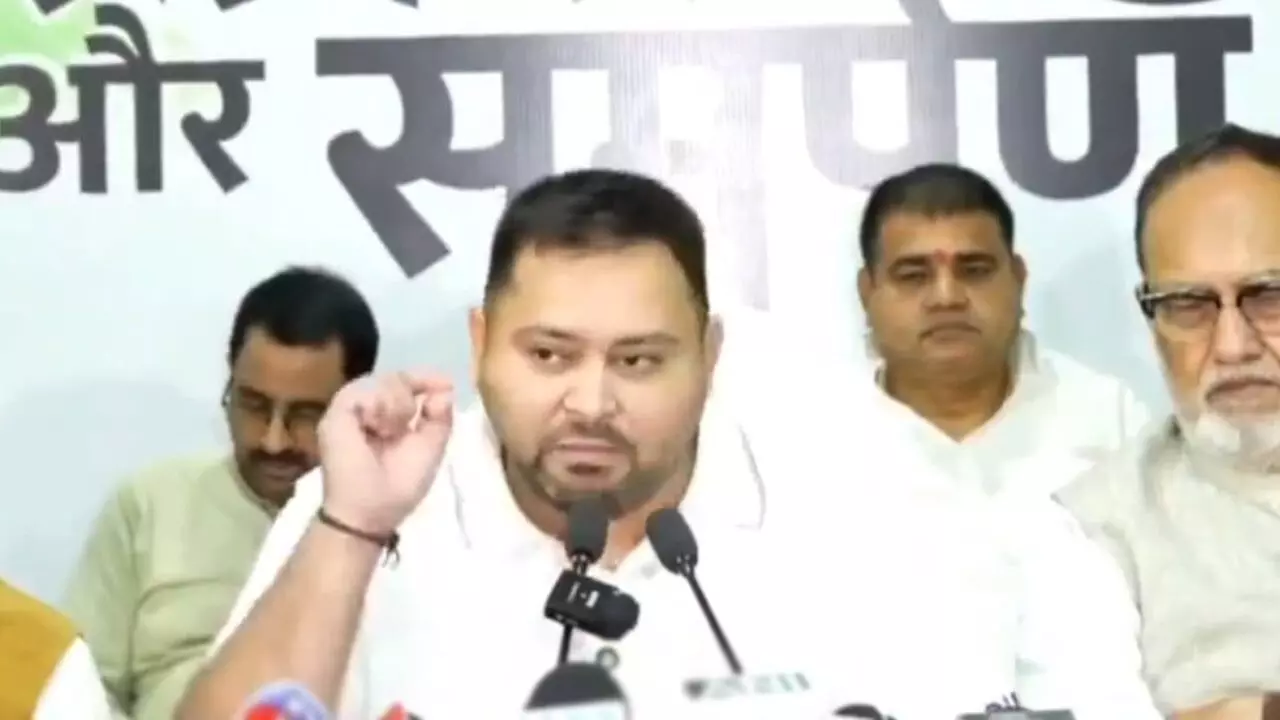 राजद नेता तेजस्वी यादव मीडिया को संबोधित करते हुए।