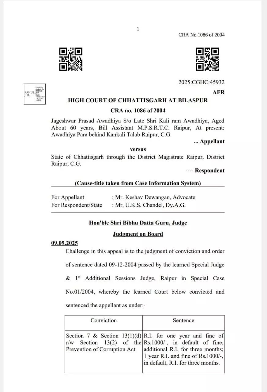 पंकज गुप्ते- बिलासपुर। छत्तीसगढ़ हाईकोर्ट ने 1986 के एक पुराने भ्रष्टाचार मामले में बड़ा फैसला सुनाते हुए एमपीएसआरटीसी के बिल असिस्टेंट रहे जागेश्वर प्रसाद अवस्थी को बरी कर दिया।