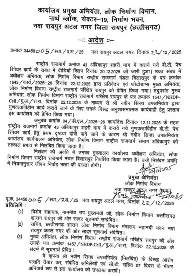 संतोष कश्यप- अंबिकापुर। हरिभूमि न्यूज की प्रमुख खबर का बड़ा असर देखने को मिला है। शहर के सदर रोड क्षेत्र में राष्ट्रीय राजमार्ग विभाग द्वारा बनाई गई गुणवत्ताहीन सड़क पर एनएच विभाग ने कड़ी कार्रवाई करते हुए अंबिकापुर के उपअभियंता नवीन सिन्हा को निलंबित कर दिया है।