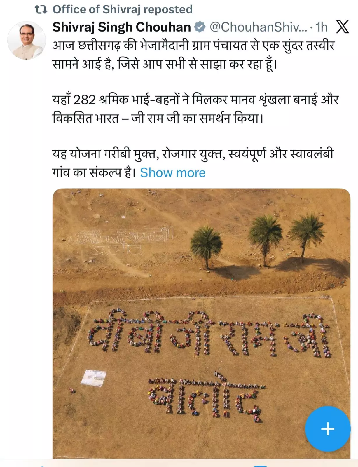 बालोद जिले के भेजामैदानी गांव में 282 श्रमिकों ने ‘वी बी जी राम जी’ के समर्थन में मानव श्रृंखला बनाई, जिसकी फोटो कृषि मंत्री शिवराज सिंह चौहान ने सोशल मीडिया में साझा कर बधाई दी. @BalodDistrict #Chhattisgarh @ChouhanShivraj pic.twitter.com/1vHdeWUpp9