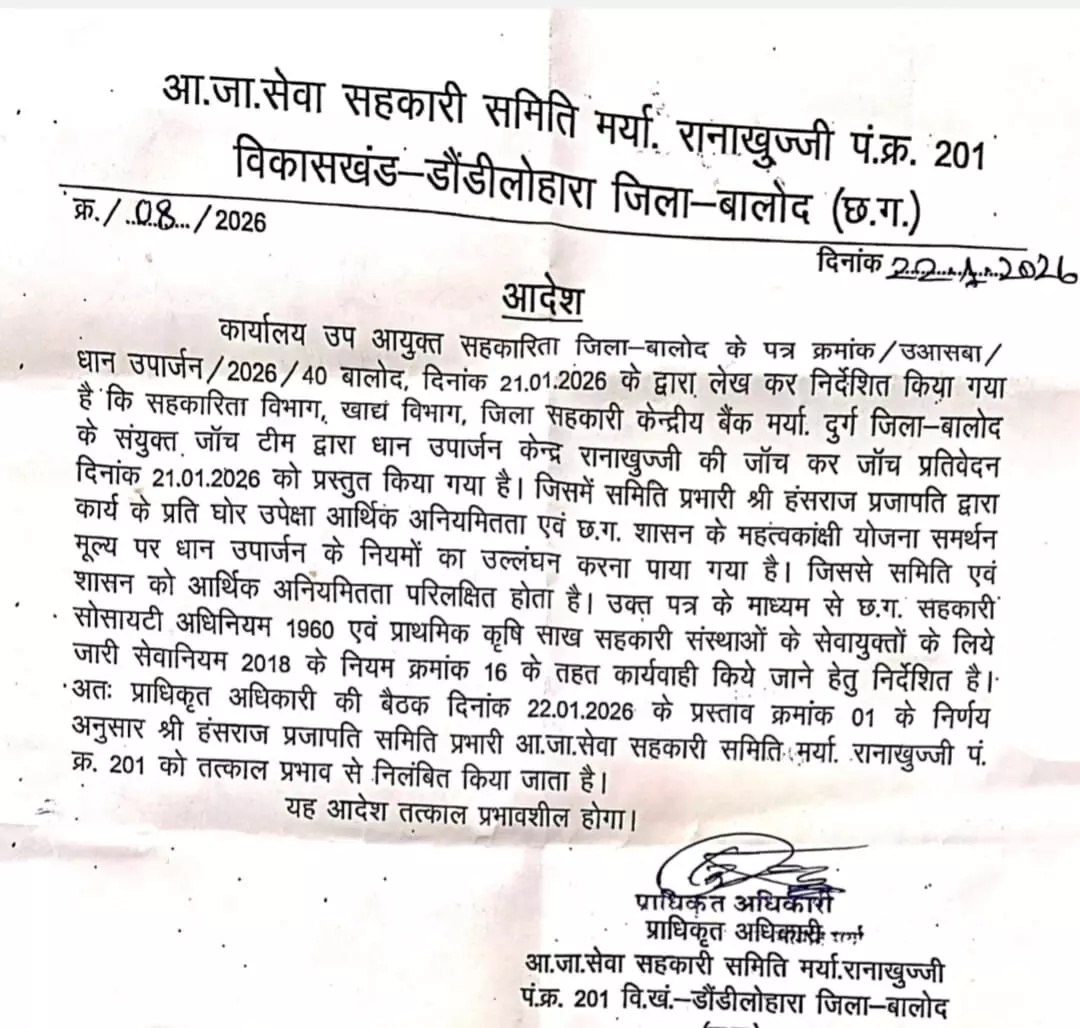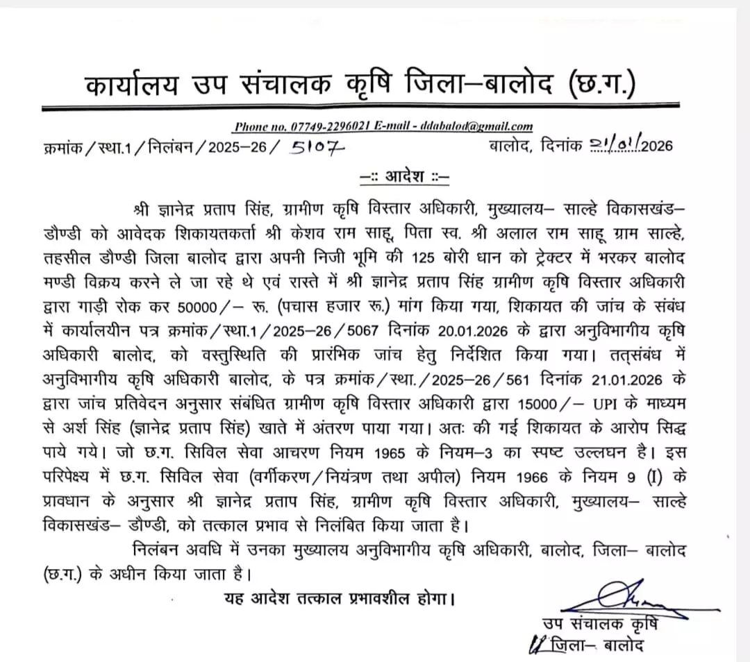 बालोद कलेक्टर की सख्त कार्रवाई: किसानों से रिश्वत लेने वाले दो अधिकारी निलंबित, खाते में ऑनलाइन करवाए थे ट्रांसफर